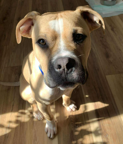 I’m a seven‑month‑old cutie, and the best guess is that I’m a bully mix—maybe with a little boxer sprinkled in. I’m 46 pounds of pure love, affection, and goofy puppy charm.