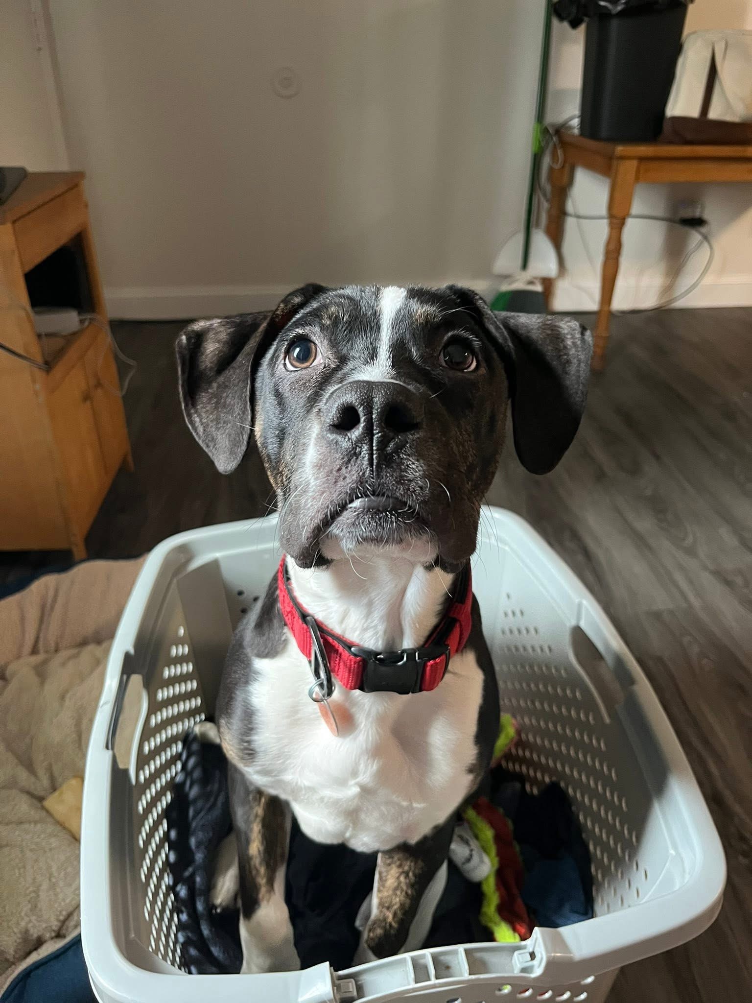 Parker is a 5 month old lab/pittie mix. He is a very sweet easy going guy. He is happy to hang out on the couch or go for a long walk, just not in the rain! He does love lots of cuddles in between. Parker is super food motivated and happy to please. He is having a little bit of a hiccup with potty training but he is getting better every day! He does well in a crate with some distractions. He also does great in a leash so that is a plus!