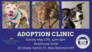 Join us for an adoption clinic on Sunday, May 17th from 1-3PM at the Boathouse Grille and meet our amazing adopt-a-bull dogs!